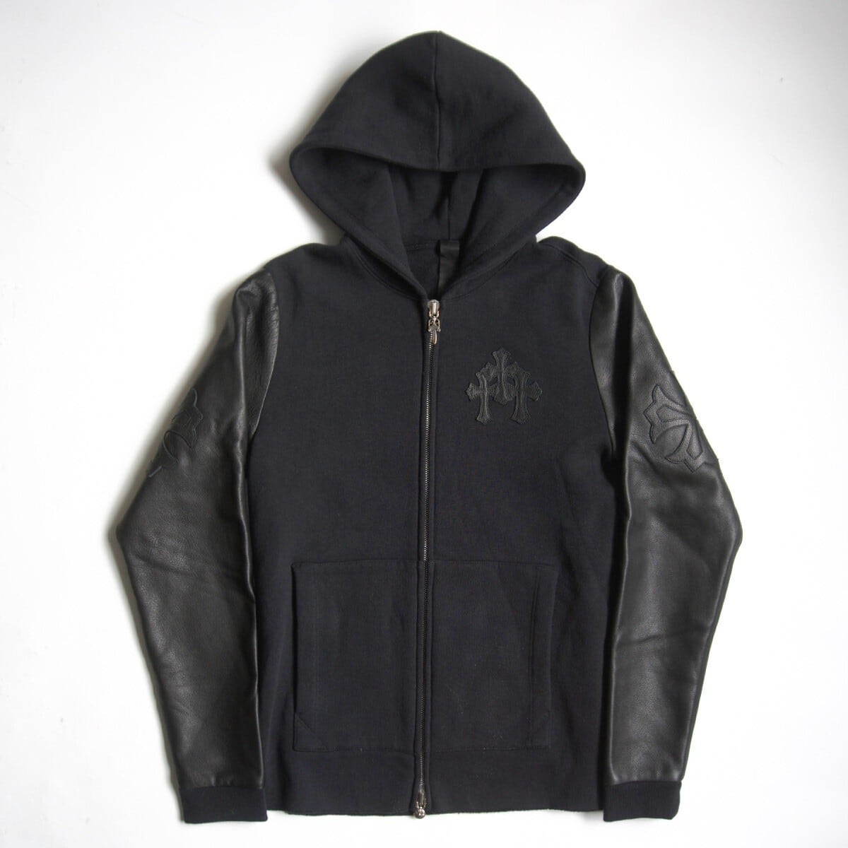 【美品】CHROME HEARTS【Y NOT Leather Cross Patch Arm Leather Switching Pullover Zip Hoodie/S】S クロムハーツ 袖レザー 26010001