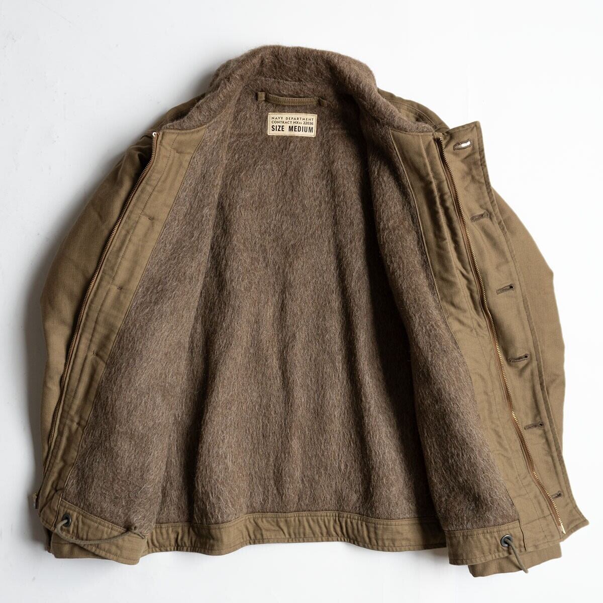 第二次世界大戦から朝鮮戦争にかけ米海軍の艦艇乗員用として採用されたN-1デッキジャケット。こちらの表素材には他のデッキジャケットと同様で通称"ジャングルクロス"と呼ばれるコットングログランが使用されております。