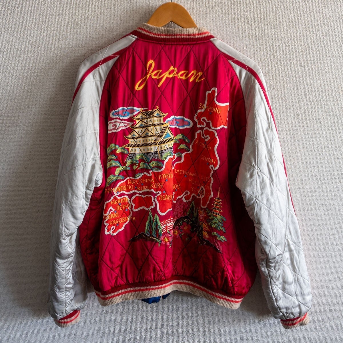 "DRAGON&TIGER×JAPAN MAP PRINT"。刺繍ではなくハンドペイントのスーベニアジャケットは大変貴重で、 ヴィンテージ市場では耳を疑うような金額で取引されている。そのなかでもこのジャパンマップのプリントはコレクターをも唸らせるウルトラレアな絶品。胸に大きくプリントされた龍、背中に力強い線で描かれた城が鎮座し、プリントに朱赤からピンクまで赤系の配色を使い分けたセンスなど衝撃の数々。1950年代当時にしか生み出すことのできない魅力に溢れた芸術的な作品でございます。お探しの方や気になる方は是非。