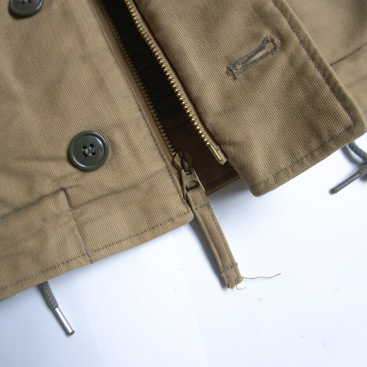第二次世界大戦から朝鮮戦争にかけ米海軍の艦艇乗員用として採用されたN-1デッキジャケット。こちらの表素材には他のデッキジャケットと同様で通称"ジャングルクロス"と呼ばれるコットングログランが使用され、裏地には遮風性と保温性に優れたアルパカ・コットン・ウールパイルが使用されています。防寒性抜群の1着です。