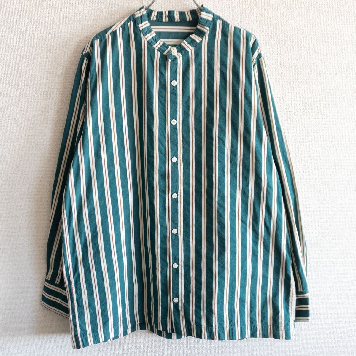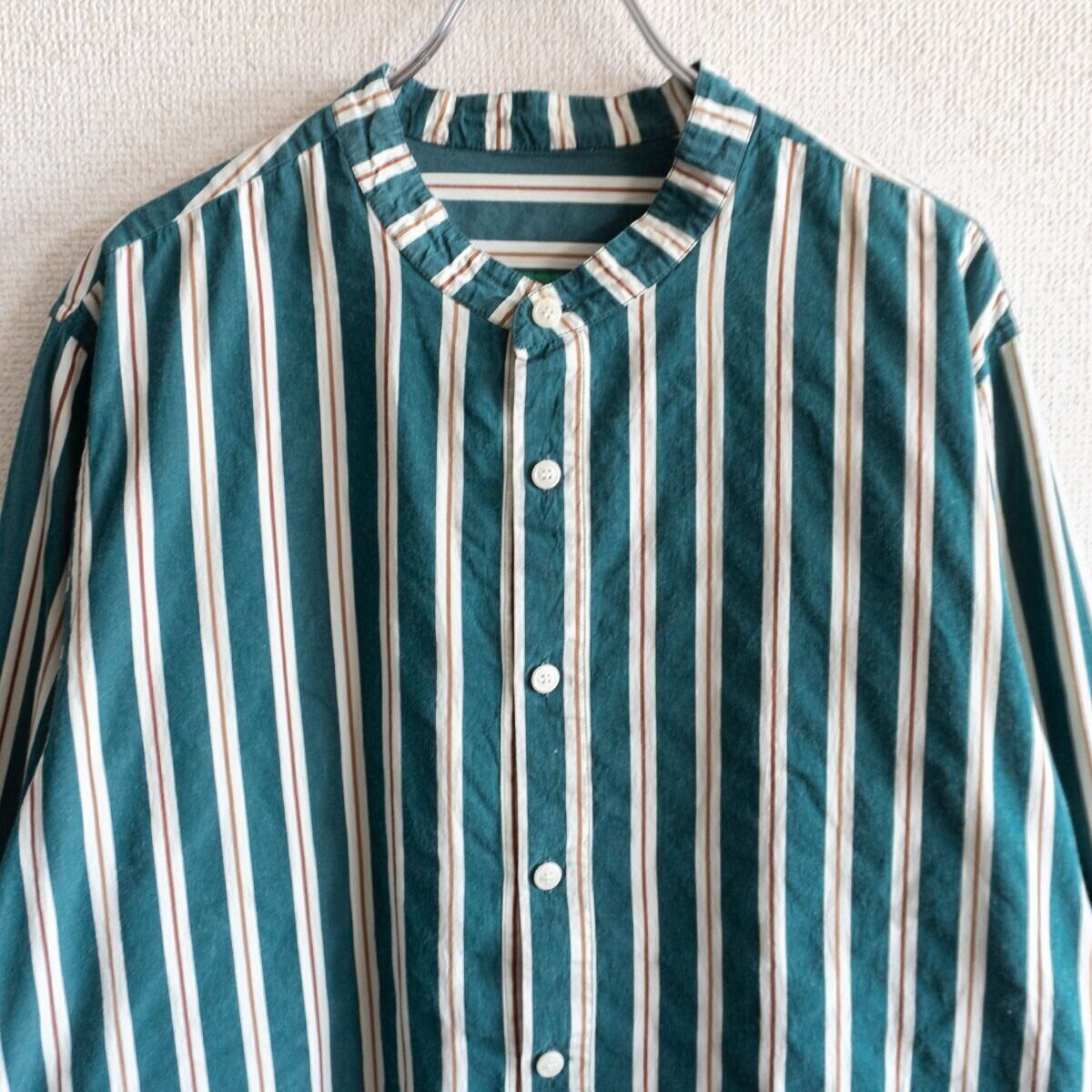 コットン素材のストライプシャツ。バンドカラーで合わせやすい一着です。良い物をお探しの方は是非。