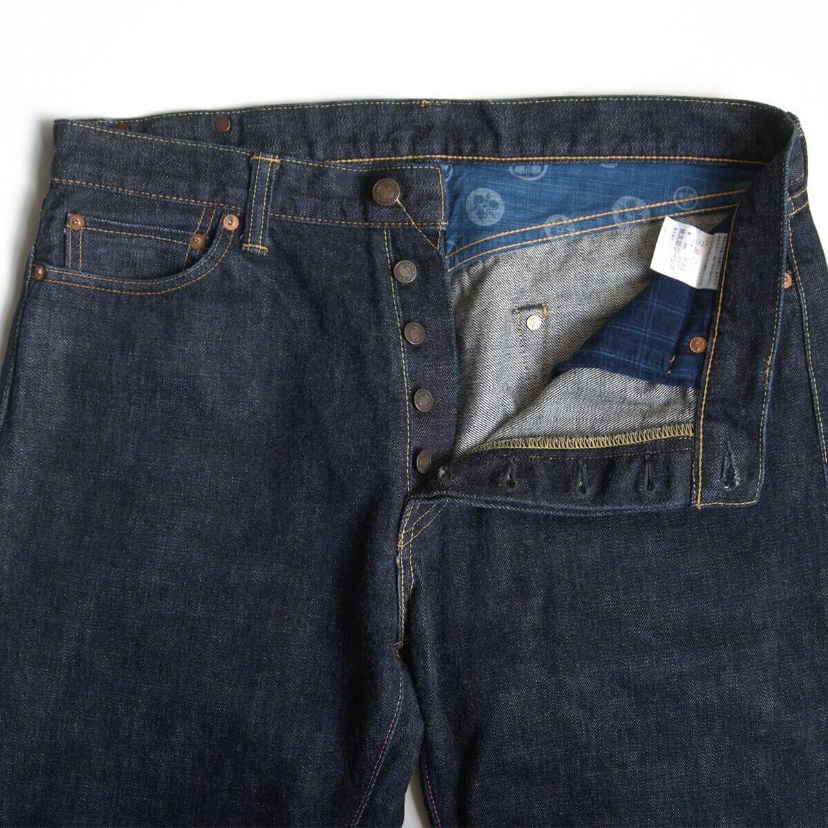 ロープ染色を繰り返し特濃インディゴブルーに染めたジンバブエコットン使用した1本。股上が深めで、太めでゆったりとしたクラシックなシルエット。これから経年変化をお楽しみいただけます。