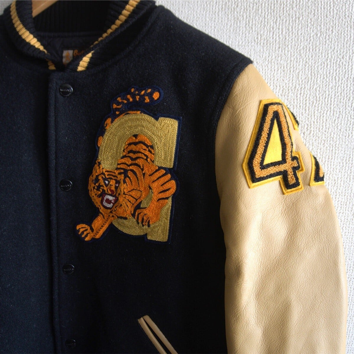 メルトンウール×レザースリーブのスタジャンです。流通の少ない希少なモデルです。お探しの方や気になる方は是非。