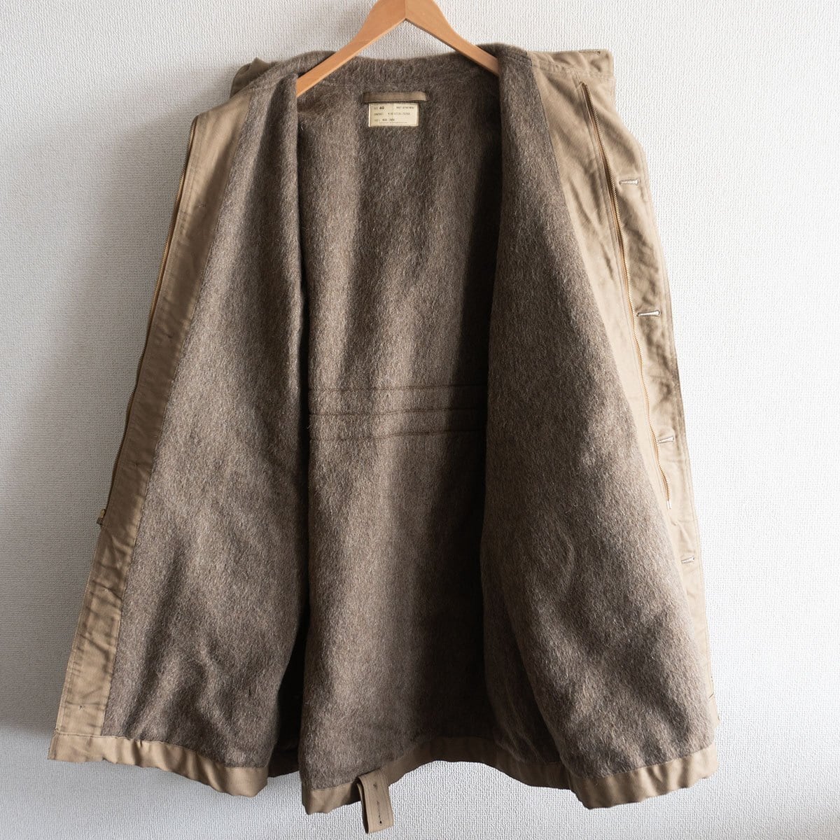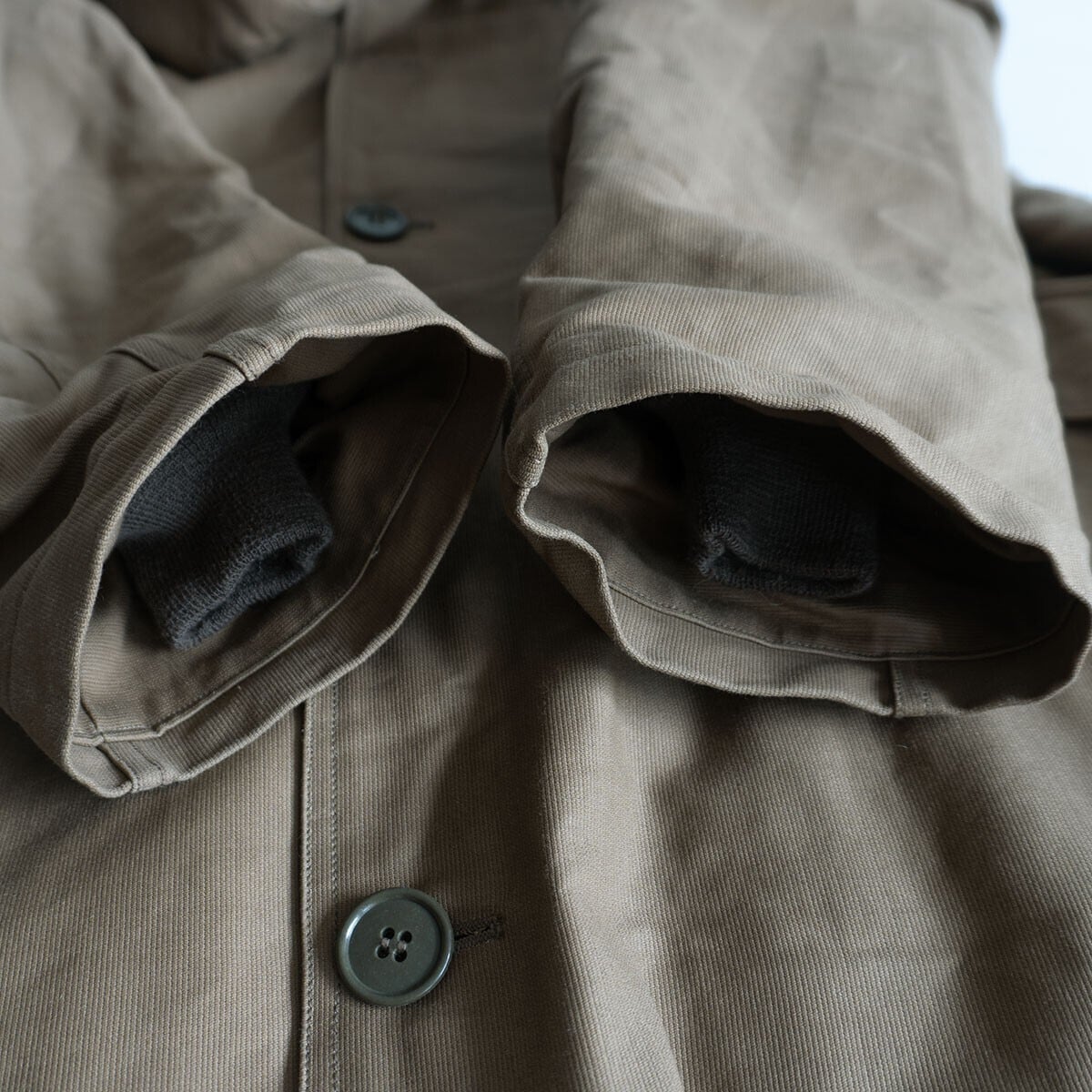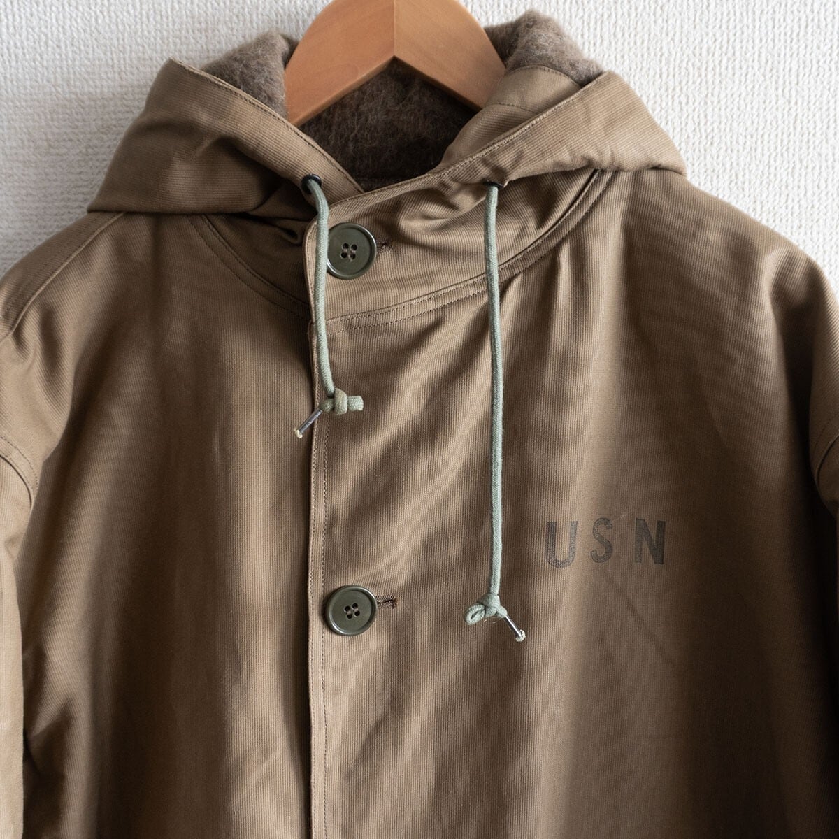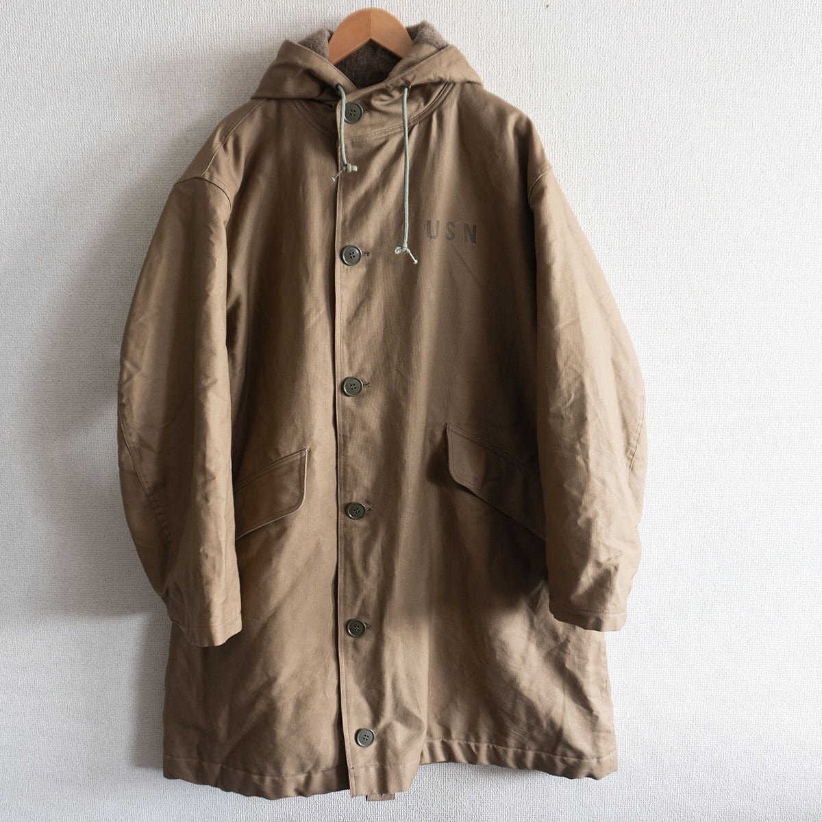 第二次世界大戦から朝鮮戦争にかけ米海軍の艦艇乗員用として採用されたN-1デッキジャケットのコートタイプのお品物です。表素材には他のデッキジャケットと同様で通称"ジャングルクロス"と呼ばれるコットングログランが使用され、裏地には遮風性と保温性に優れたウールパイルが使用されています。防寒性抜群の1着です。