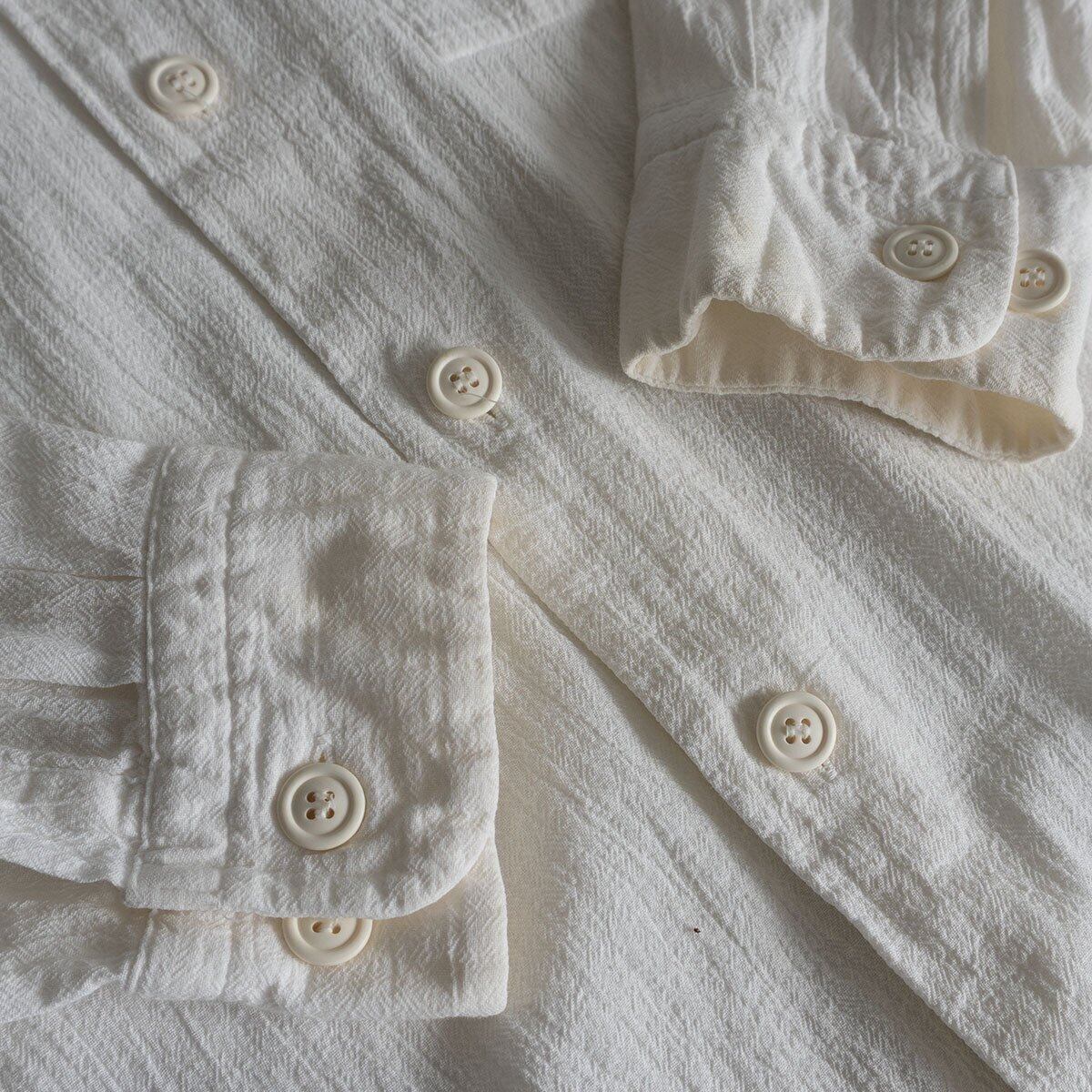 シワ加工コットン素材のバンドカラーシャツ。お色はホワイトです。良い物をお探しの方は是非。
