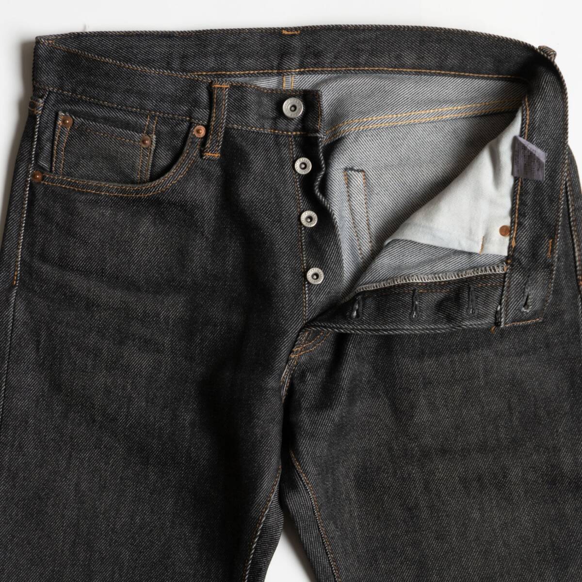 復刻モデル、硫化染料で染めたブラックデニムのお品物。21オンスの極厚デニム地のストレートパンツです。