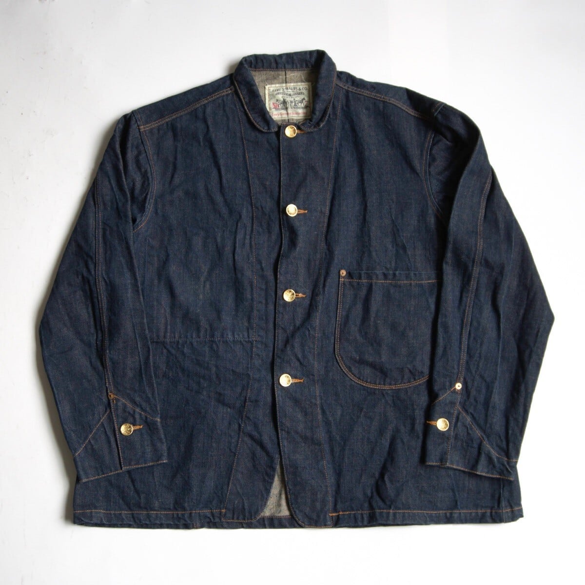 レプリカモデルの中でも数の少ない1800年代後半~1900年代前半の廉価版と呼ばれる214の復刻。襟はスタンドカラーとしてもご着用いただけます。パッチはお馴染みのリネン白パッチ、全てのボタンは取り外し可能なチェンジボタン、ポケットはフロントに一つで、インナーポケットも一つ付いています。元々生産ロット数のとても少ないモデルで、現在ではあまり市場に出回る事のない希少な1着です。まだまだ色が残っているため、これから経年変化をお楽しみいただけます。お探しの方や気になる方は是非。