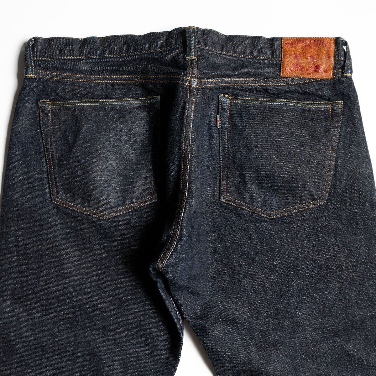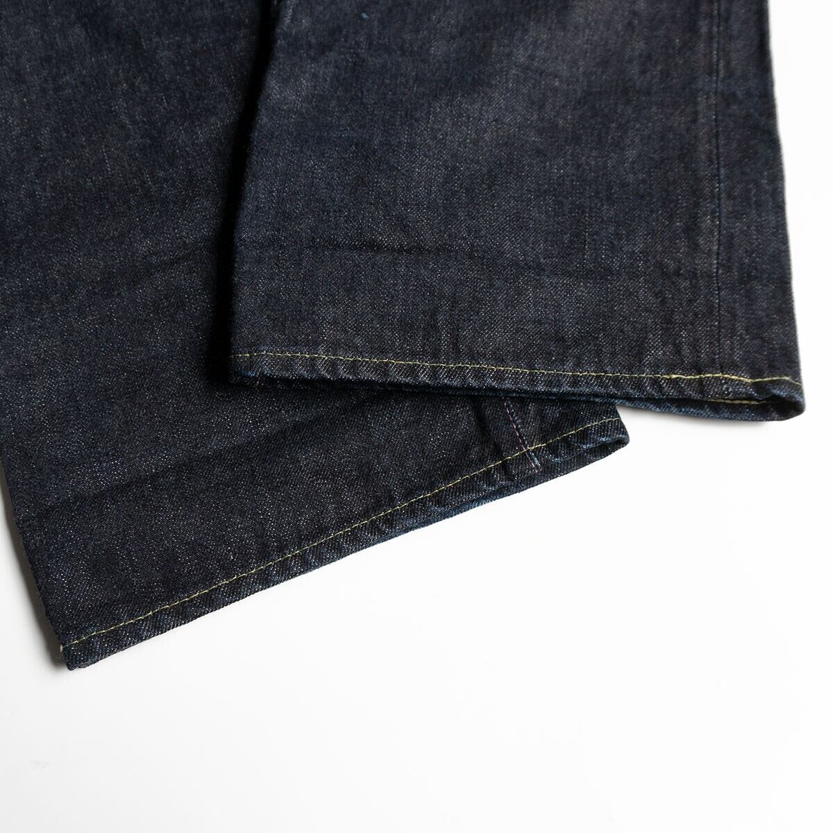 ロープ染色を繰り返し特濃インディゴブルーに染めたジンバブエコットン使用した1本。股上が浅く、細身で若干テーパードの入ったタイトストレートです。これから経年変化をお楽しみいただけます。