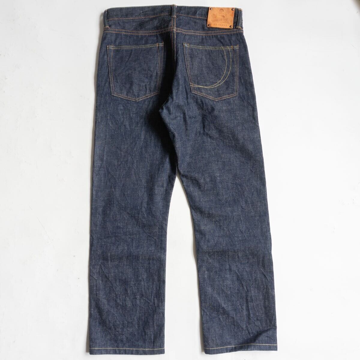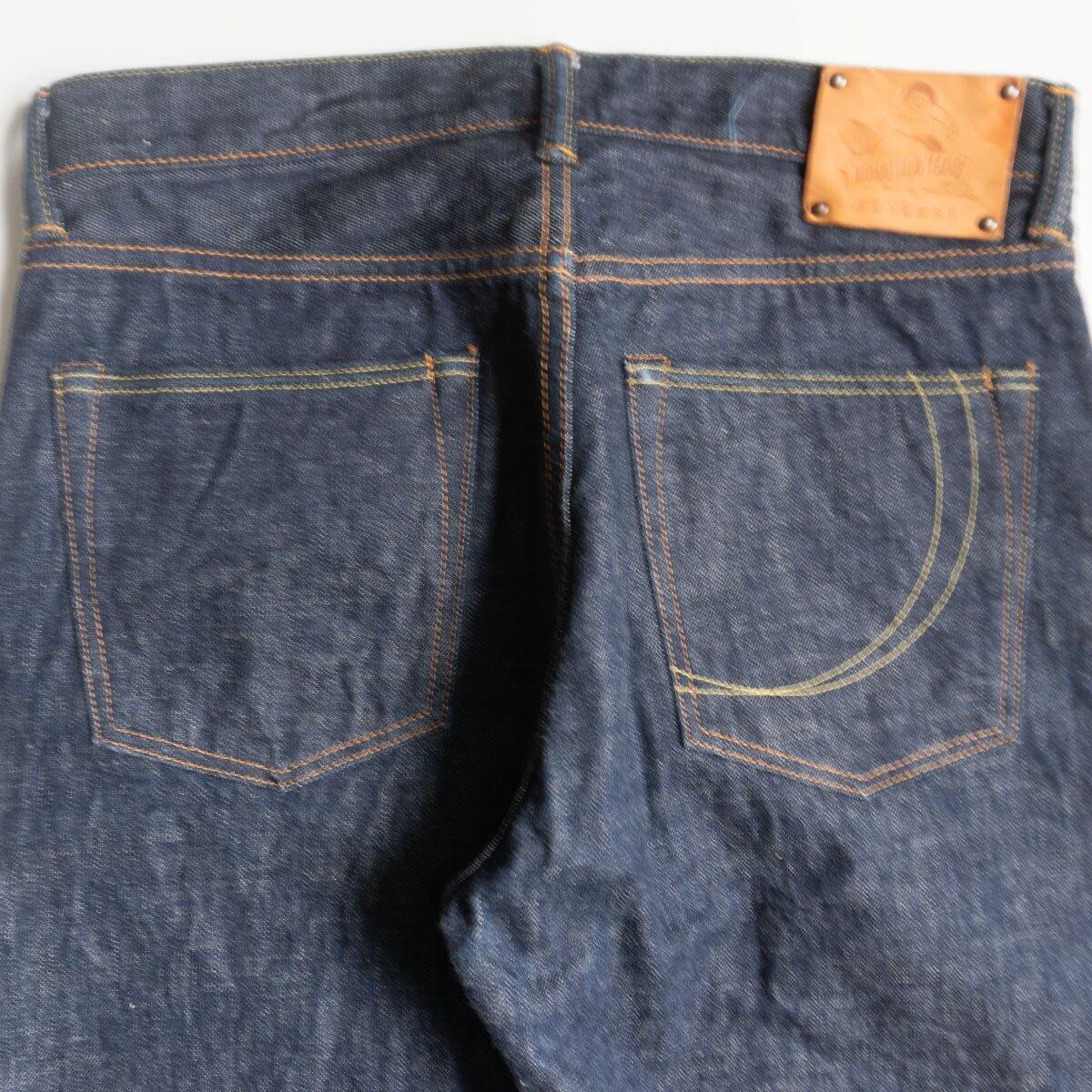 ロープ染色を繰り返し特濃インディゴブルーに染めたジンバブエコットン使用した1本。股上が深く、もも周りはゆったり目で膝下から強くテーパードをかけたストレートシルエットです。これから経年変化をお楽しみいただけます。