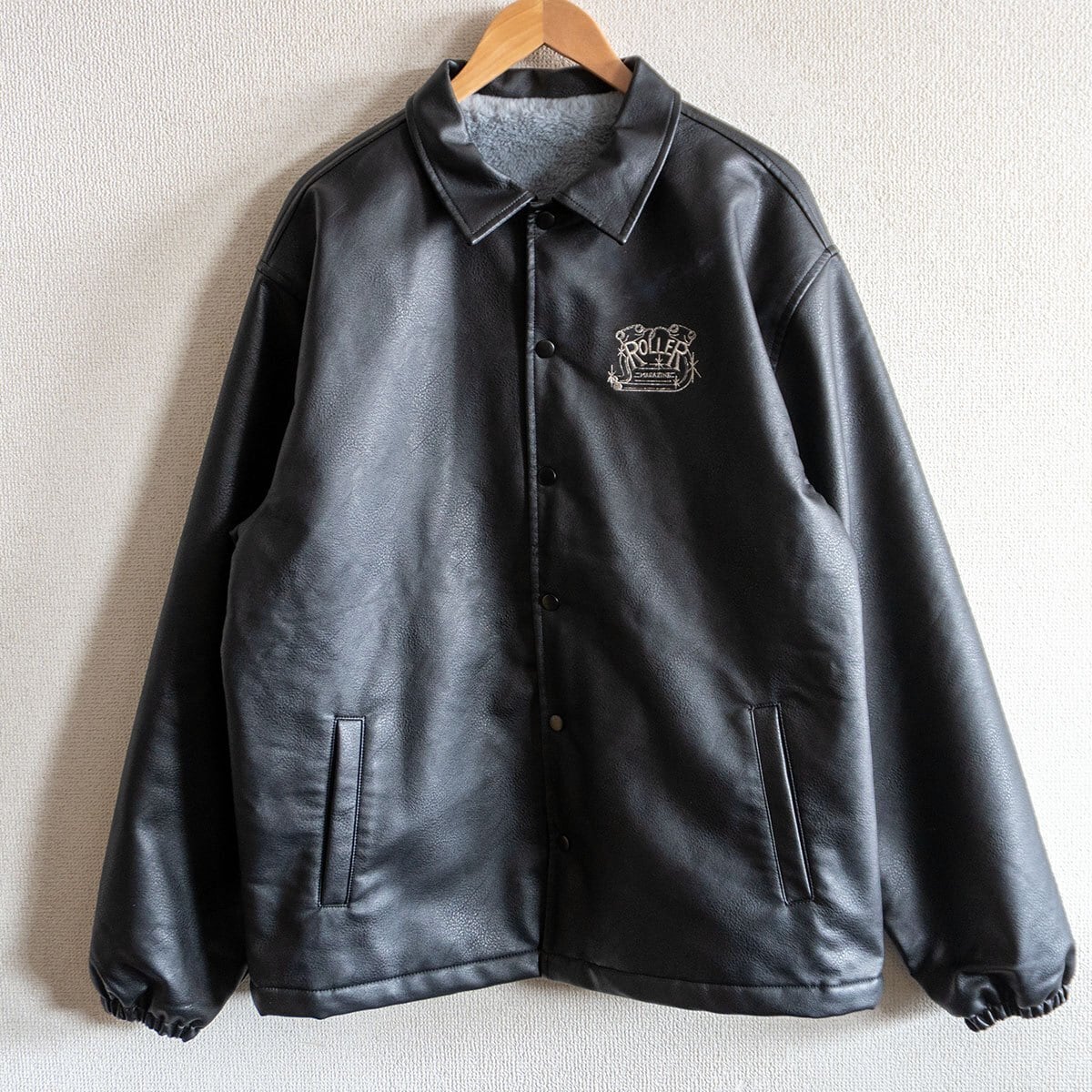 Roller magazineオリジナルのフェイクレザーコーチジャケット。本革のようなシボの質感と手触りを表現。軽量かつ柔らかく着心地の良いジャケットです。Rollerはシルバーの刺繍にシルバーのボアとなります。お探しの方や気になる方は是非。