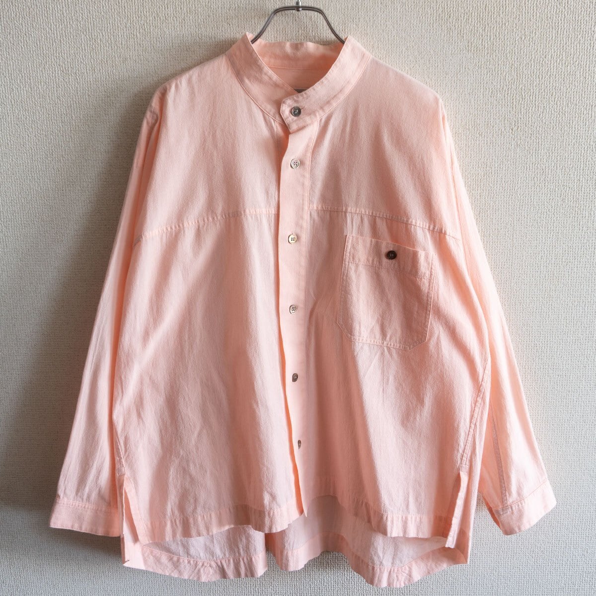 コットン素材のスタンドカラーシャツ。お色は薄いピンクです。