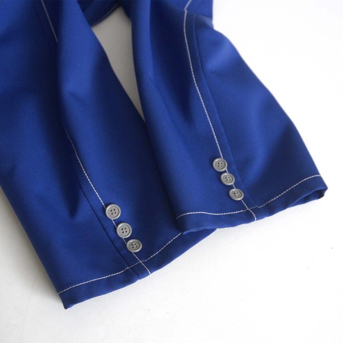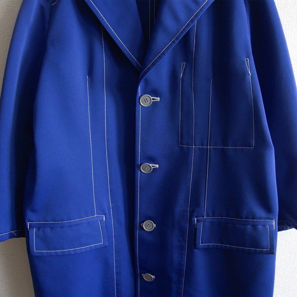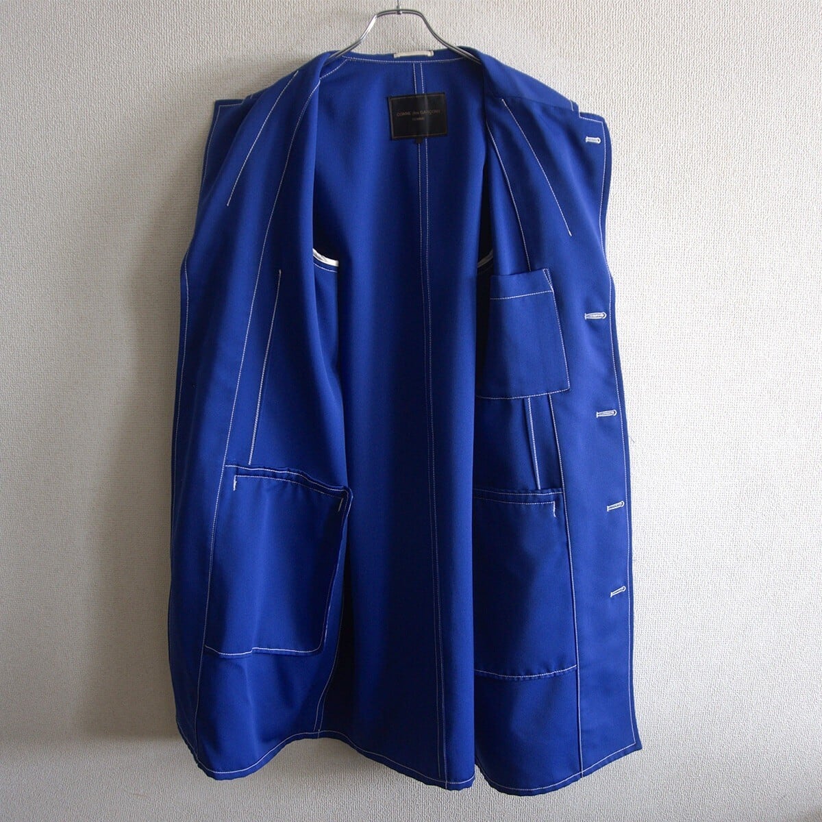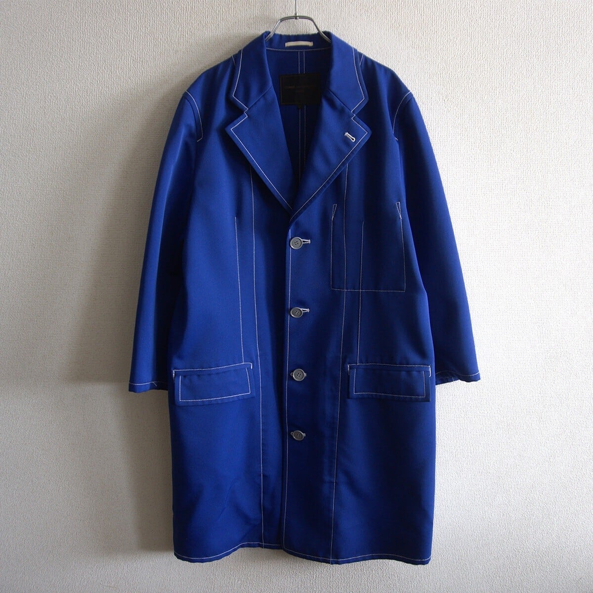 ギャルソンオムのチェスターコート。軽量で着用しやすいポリエステル素材を使用しています。お色はブルーです。