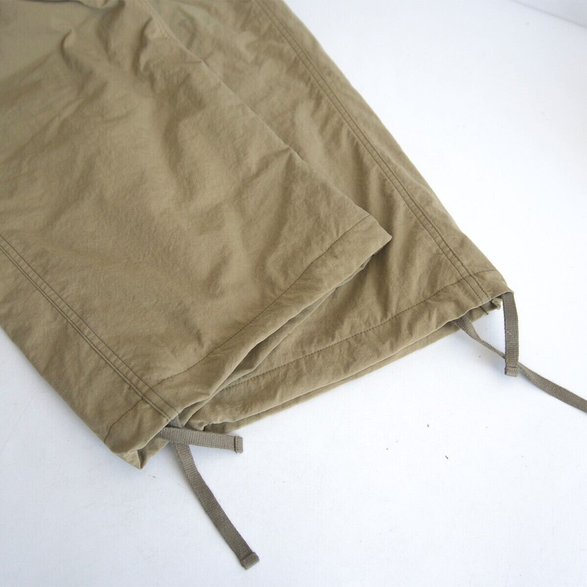 ヴィンテージのスノーパンツをベースにしたデザイン。ナイロン特有のつるっとした質感を避け、コットンのような質感です。ナイロンなので生活撥水程度なら水を弾く仕様。またコットンとは異なり、軽やかな穿き心地で非常に快適です。裏地が 総裏のフリース付きのお品物です。