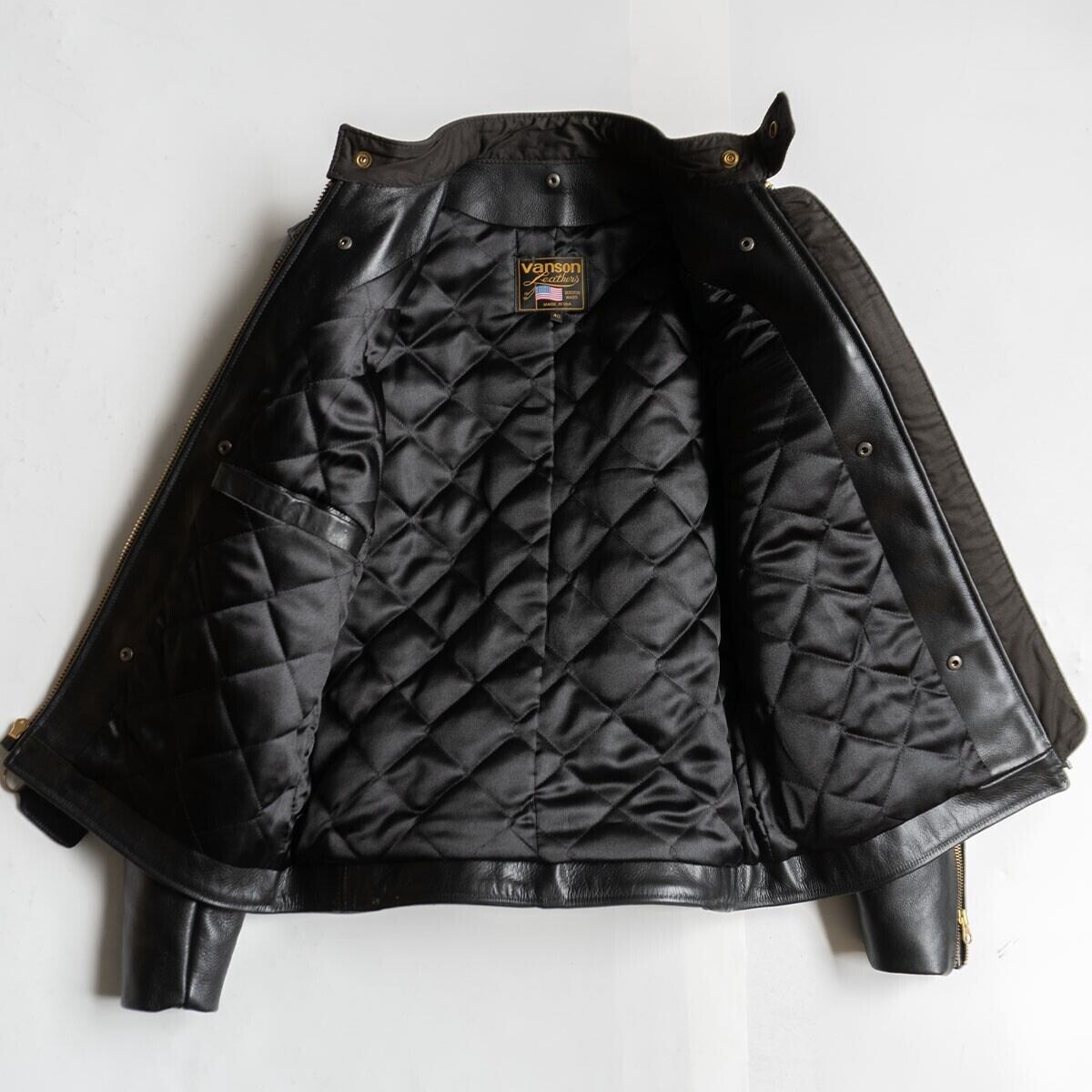 バンソンの数あるラインナップの中、ベーシックかつポピュラーなモデルです。最大の魅力はバンソンの象徴とも言えるコンペティションウエイトレザー。独特の光沢を放つクローム仕上げのトップグレインカウハイドは着込む程に体に馴染み、自分だけのエイジングを楽しむ事が出来ます。内側はキルティングです。お探しの方や気になる方は是非。