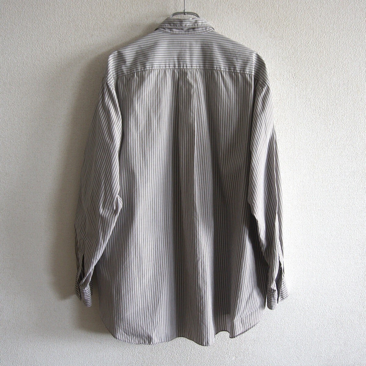 フロントの切替デザインが特徴のお品物。身幅が広くゆったりとしたシルエットのシャツです。お色がブラウン系、ホワイトストライプ。お探しの方や気になる方は是非。