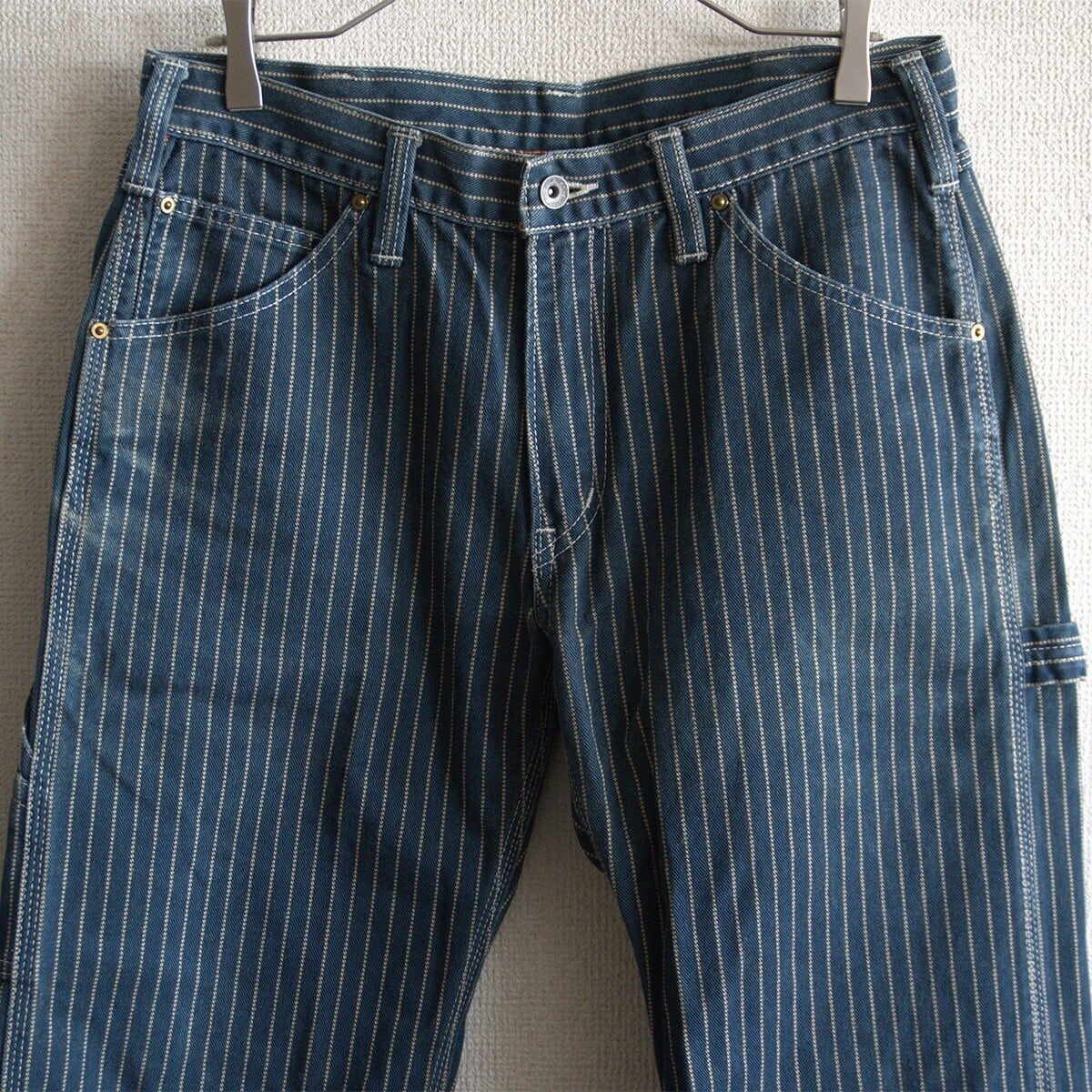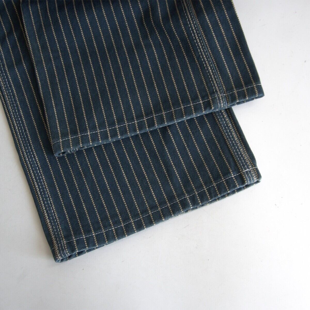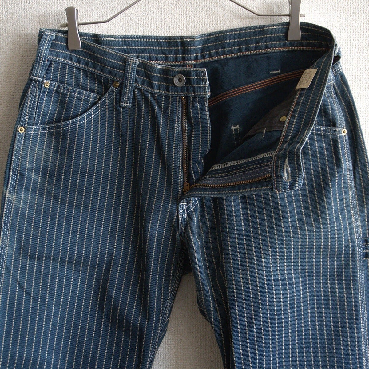 しっかり染めた経糸と緯糸で織り上げ昔ながらの抜染手法でドットプリントを配したモデル。右足にスケールポケット、左足にハンマーループを装備。リベットは昔ながらの真鍮色の無地タイプを採用。スッキリしたシルエットで、各部の縫い合わせをワークパンツらしく強度のある3本ステッチで縫い上げています。お探しの方や気になる方は是非。