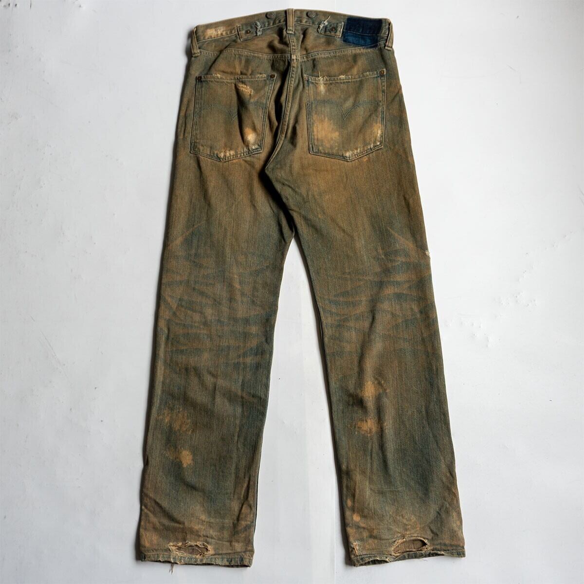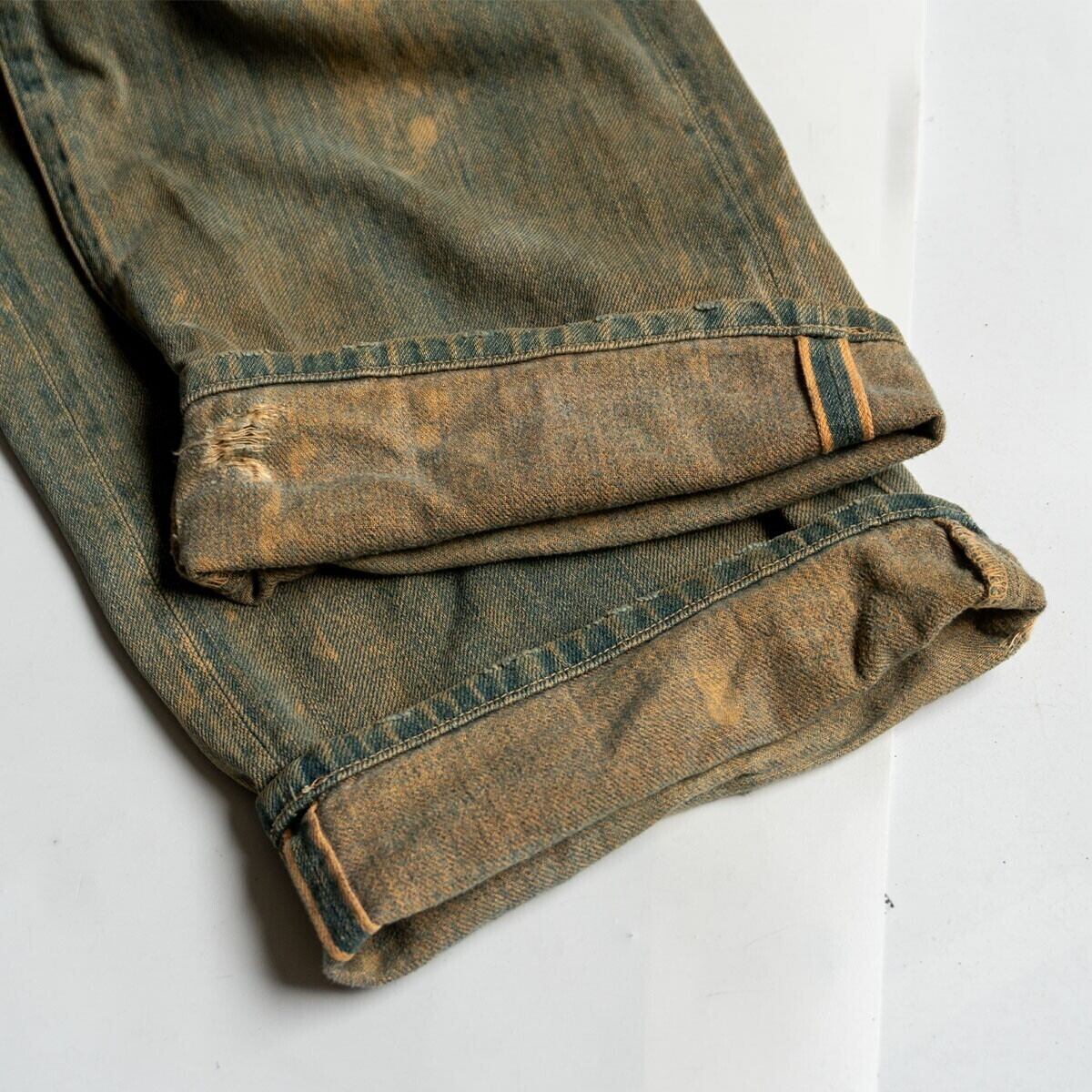 こちらは現存する本物のヴィンテージを余す所無く忠実に再現した加工モデル。ハードな汚しやダメージ、手縫い風のリペア、パッチの欠品やカットされたシンチベルトまで忠実に再現された究極のモデルです。お探しの方や気になる方は是非。