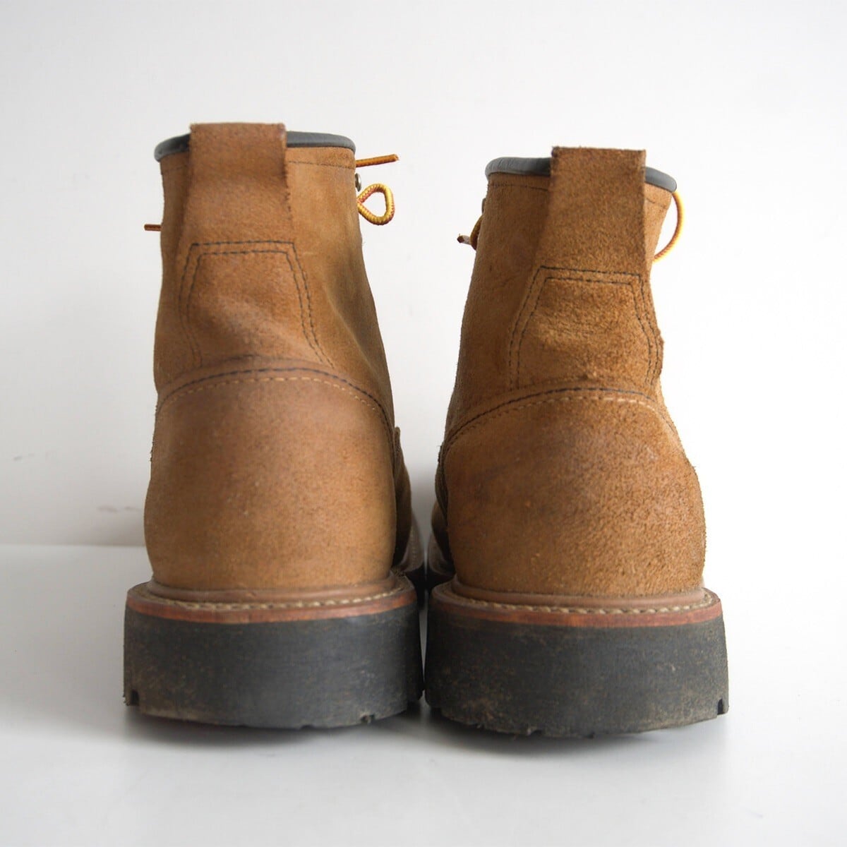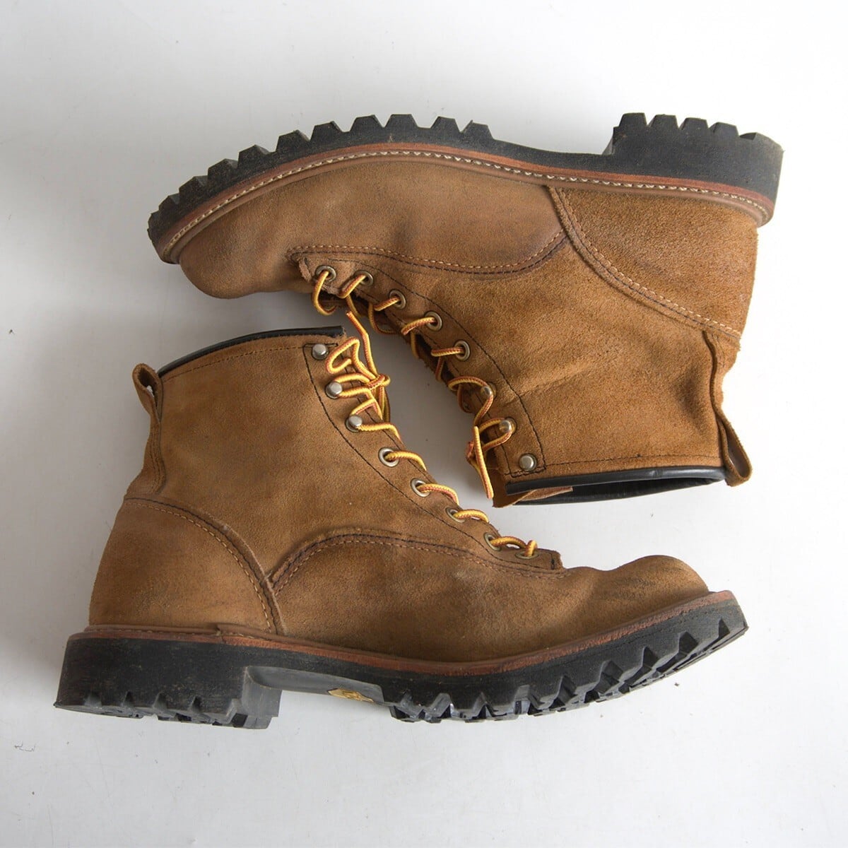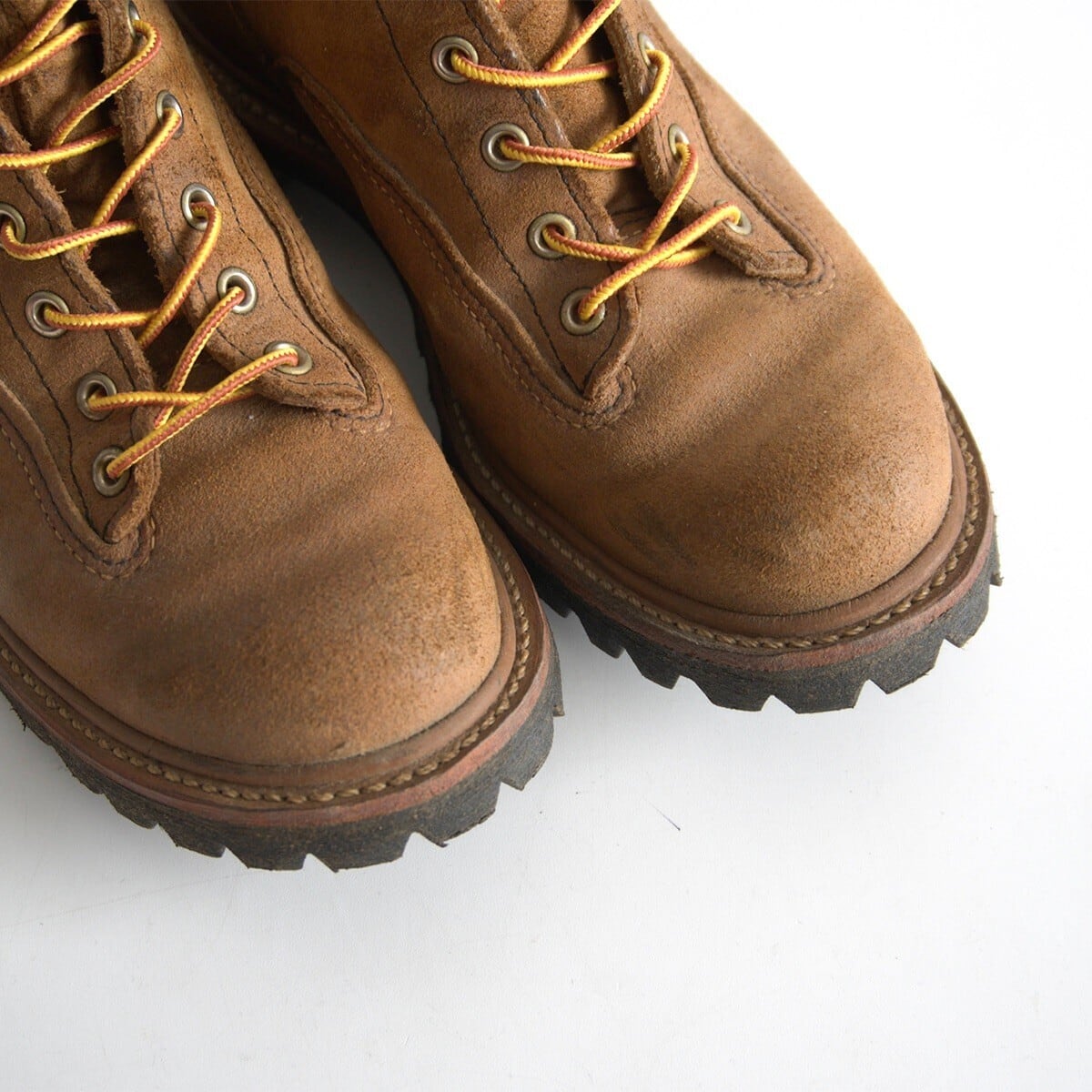 廃番人気モデル『ラインマンブーツ』。アメリカのライフラインを確保する電線工【ラインマン】は最も危険な仕事とされていました。高所での作業の安全性を確保するため、つま先近くまでシューレースが施され、足をしっかりホールドできる設計となっております。当時のラインマン達がこのブーツを選んだため、【ラインマンブーツ】として名づけられました。無骨なオイルドスエードレザーを使用したお品物です。