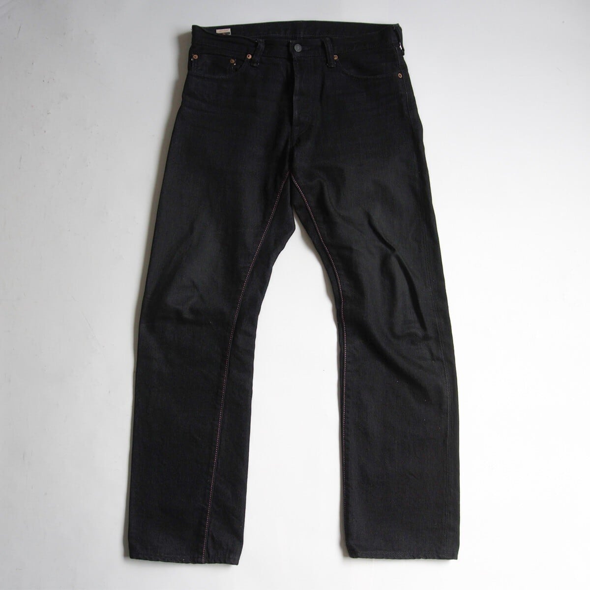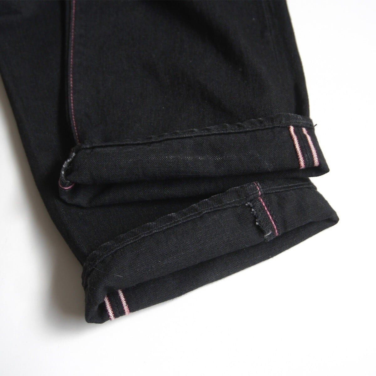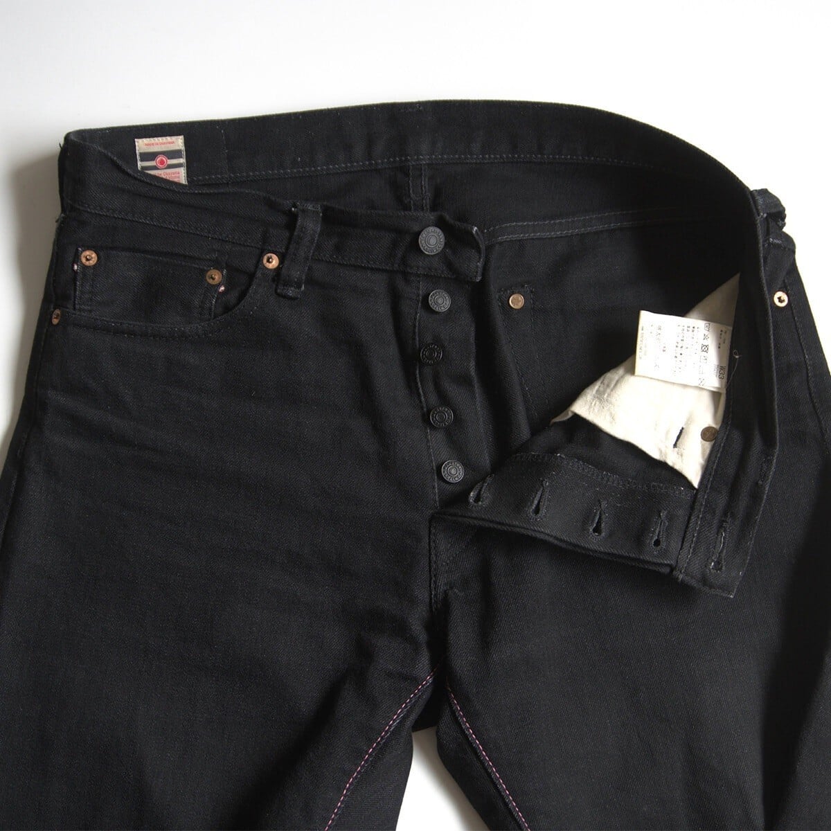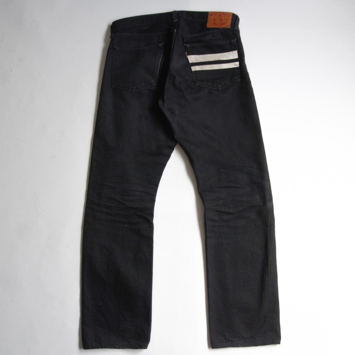 経糸・緯糸共に黒の硫化染めの糸を使用した1本。特徴は、藍染ほど色落ちがせず使うほどに程よく色が抜け独特の風合いを増します。ソフトな穿き心地と同時にデニム本来の武骨さも兼ね備えています。目の詰まった黒色はまさに漆黒と呼ぶに相応しい表情です。モモからスソまでは若干のゆとりを持たせたミドルフィットです。これから経年変化をお楽しみいただけます。
