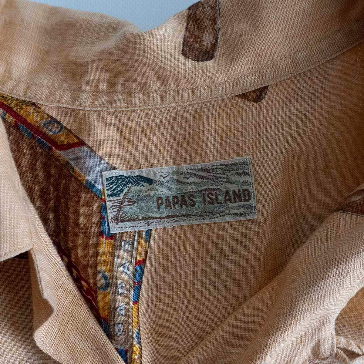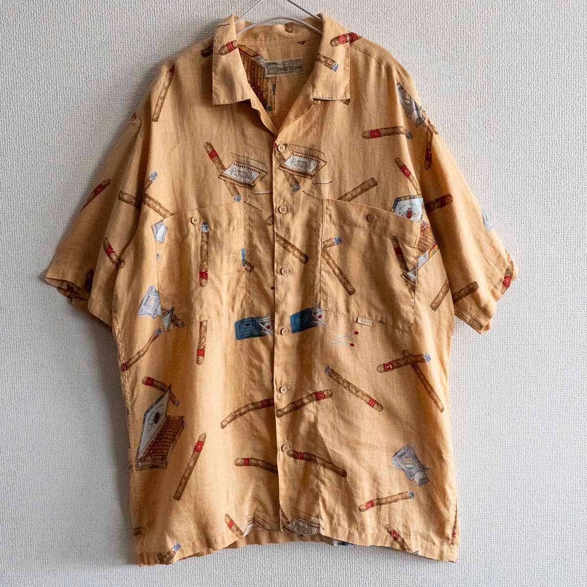 【美品】PAPAS 【タバコ柄 リネン アロハシャツ】L 柄 半袖 パパス たばこ 煙草 麻 25020508